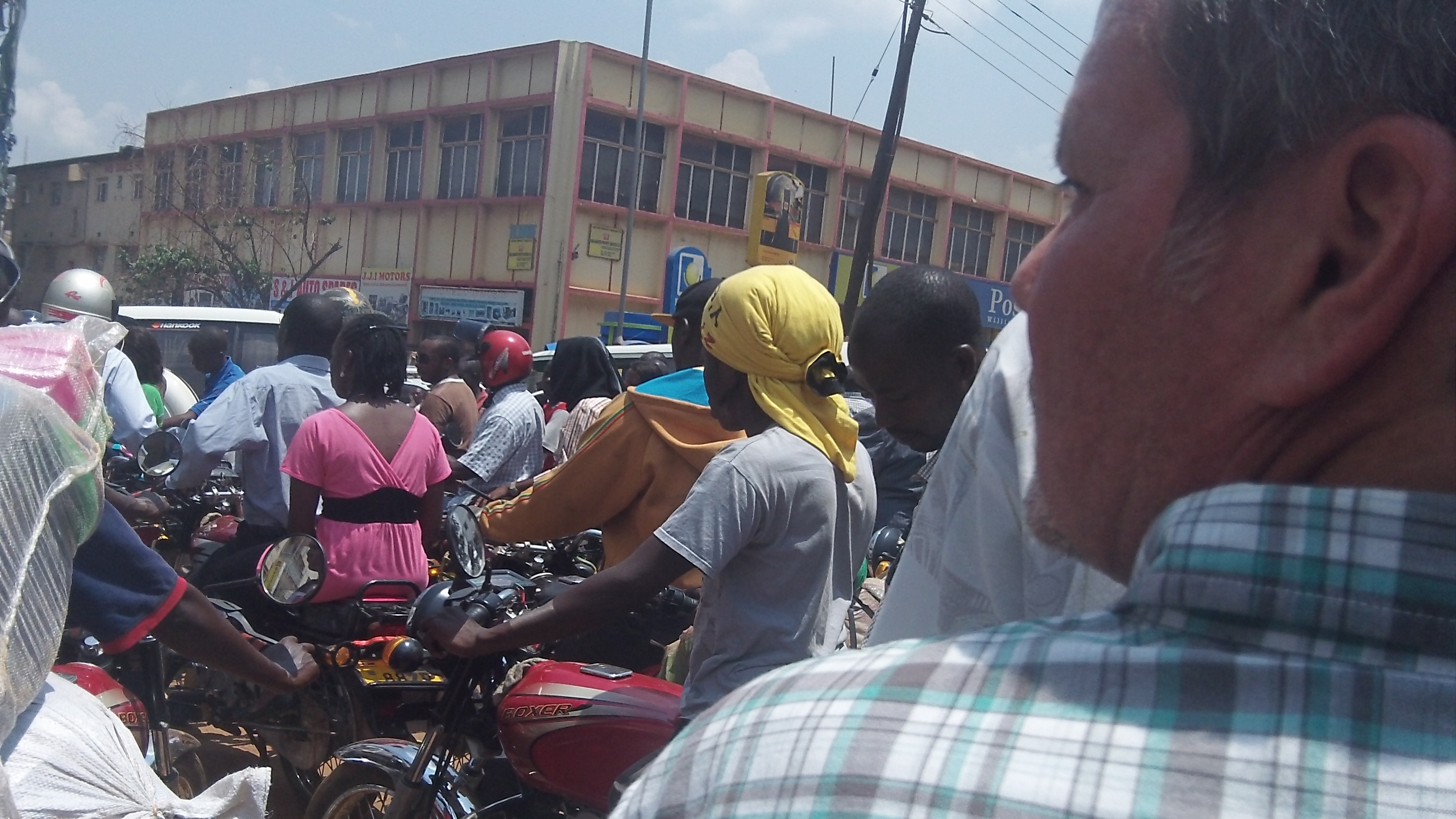 Traveling downtown Kampala by motorcycle taxi (Boda-boda)