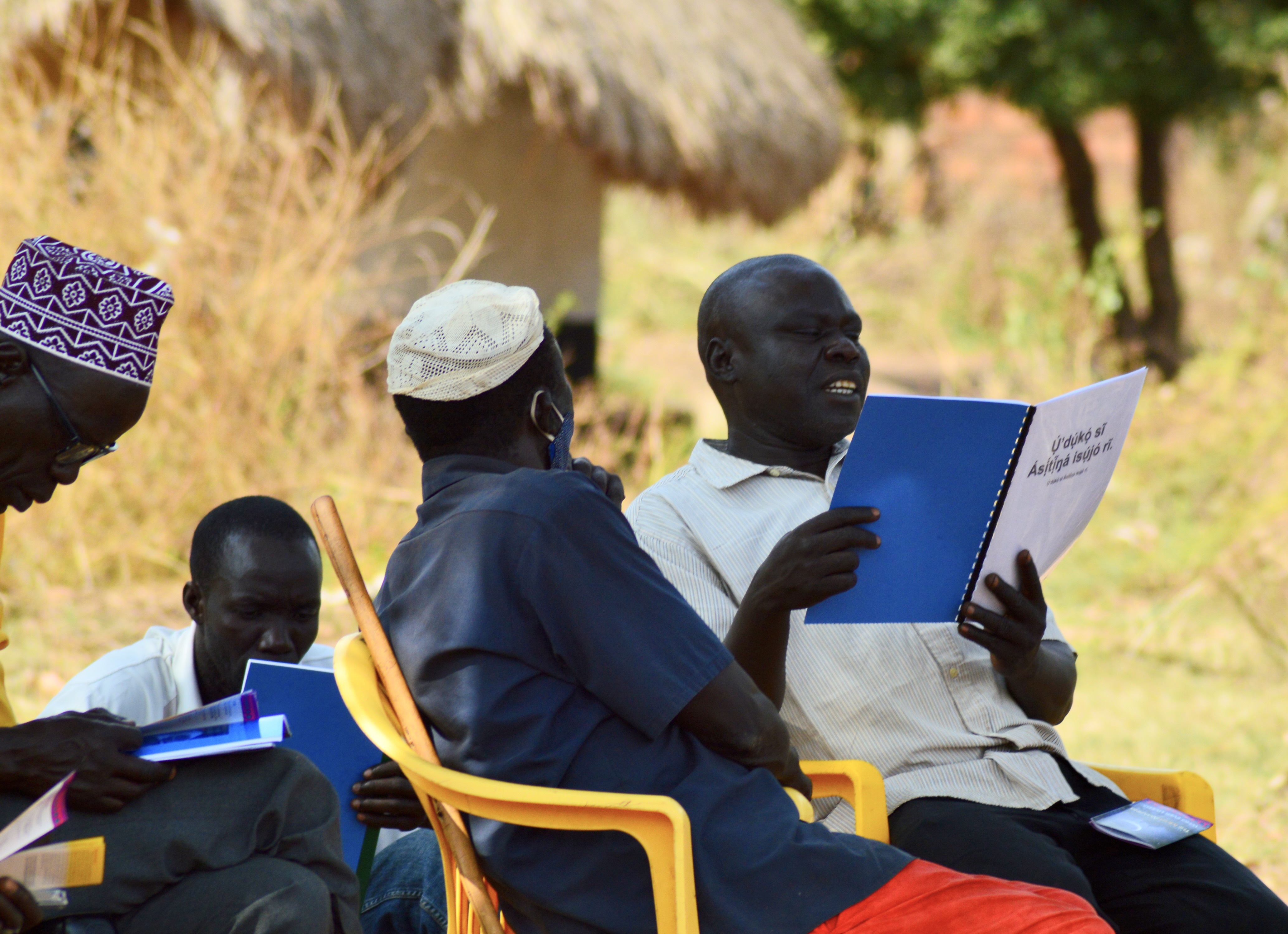 While we were waiting for a friend to arrive, we were able to interact and get to know some of the community members. During this time we gave some reading materials, in this case, in Aringa–some New Testaments and other Christian literature translated from English to Aringa by our friend, Onduga Charles. I am very grateful that Charles was able to join us as my interpreter in Aringa. Charles can (usually) pick my English as well as pick my heart and spirit and can explain what I am saying in a way that reflects my heart and meaning. We have been working together since 2014 and he has interpreted in Christian-Muslim Dialogs and Open air preaching in the markets on market days.