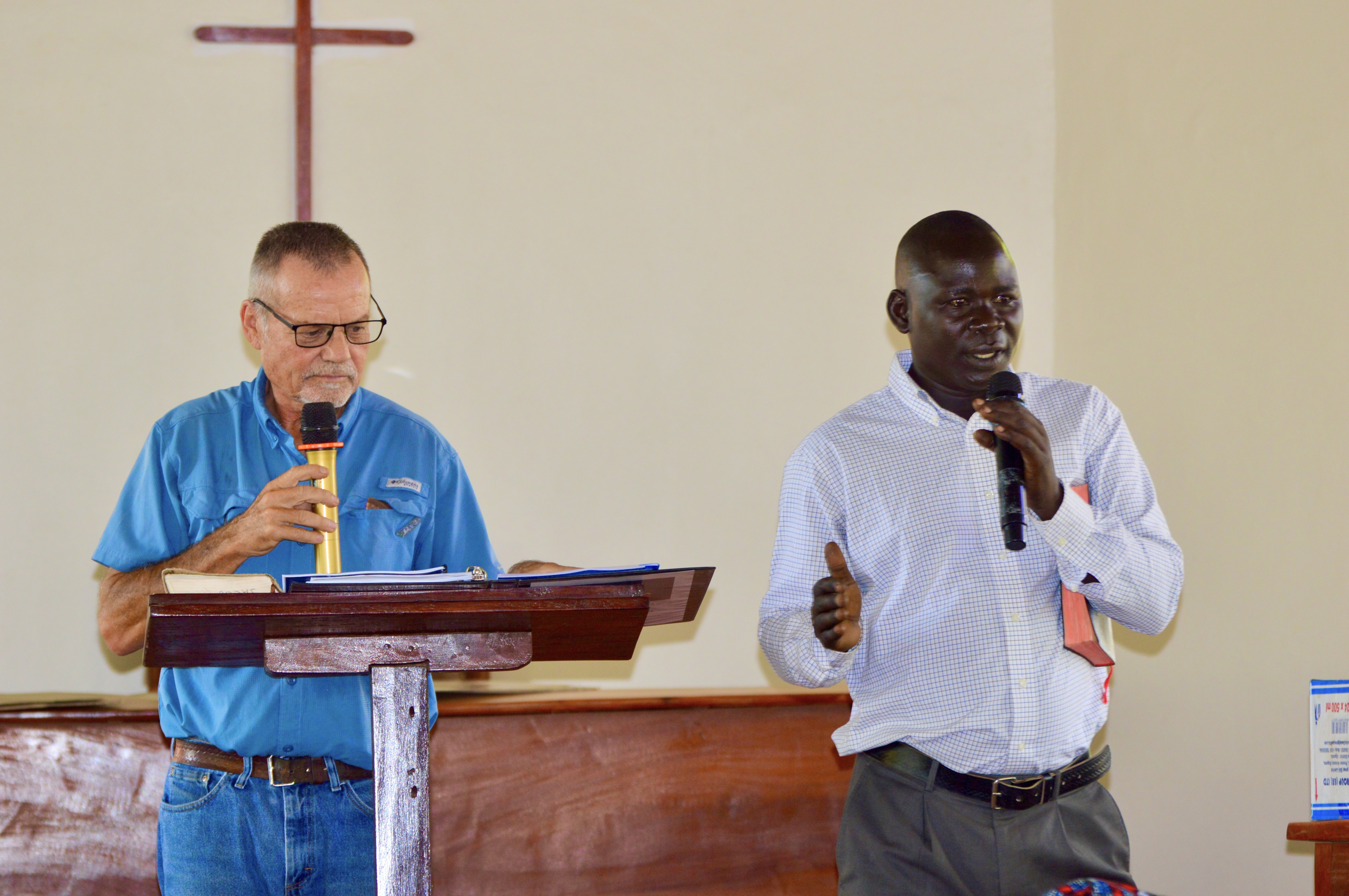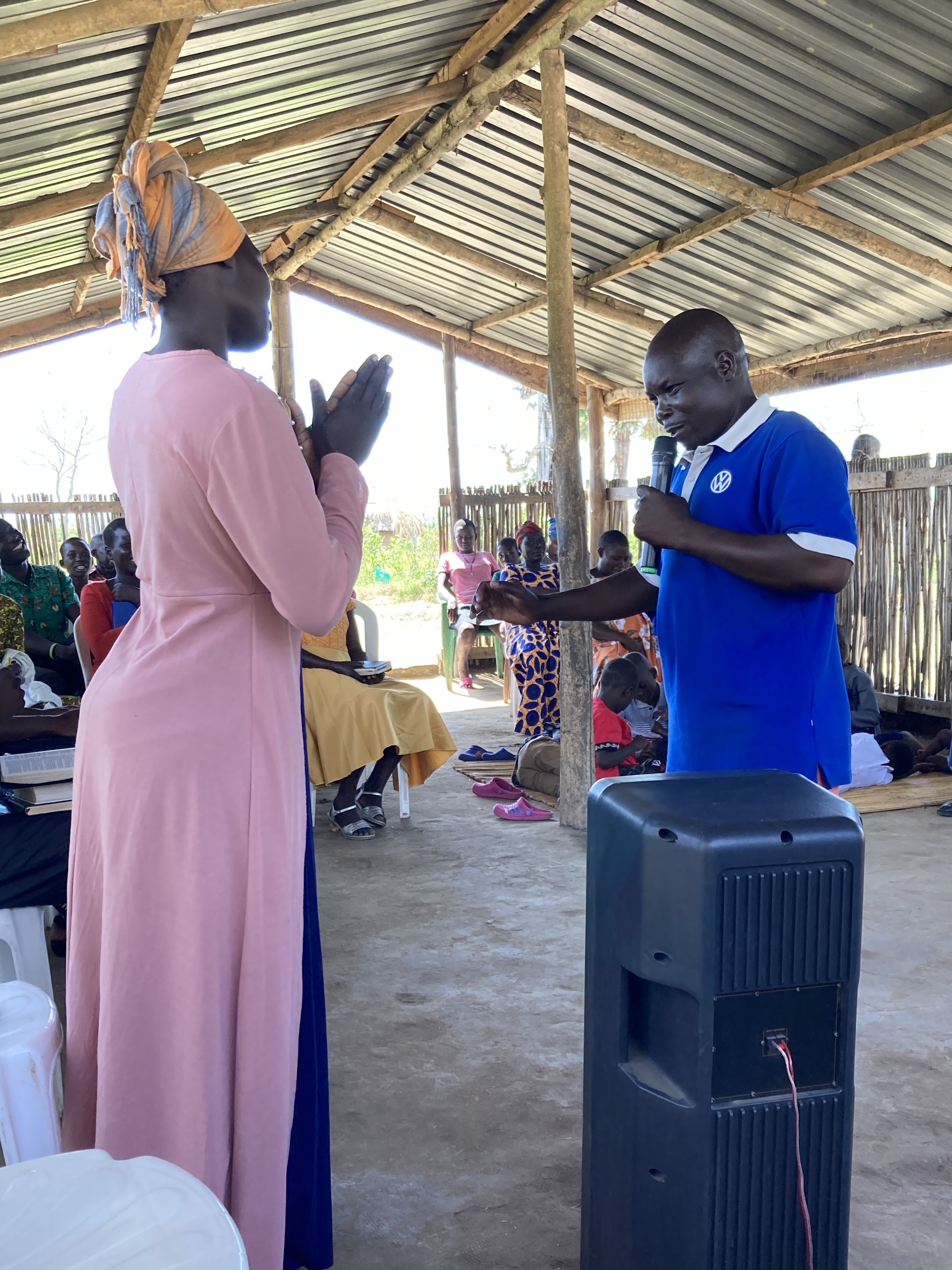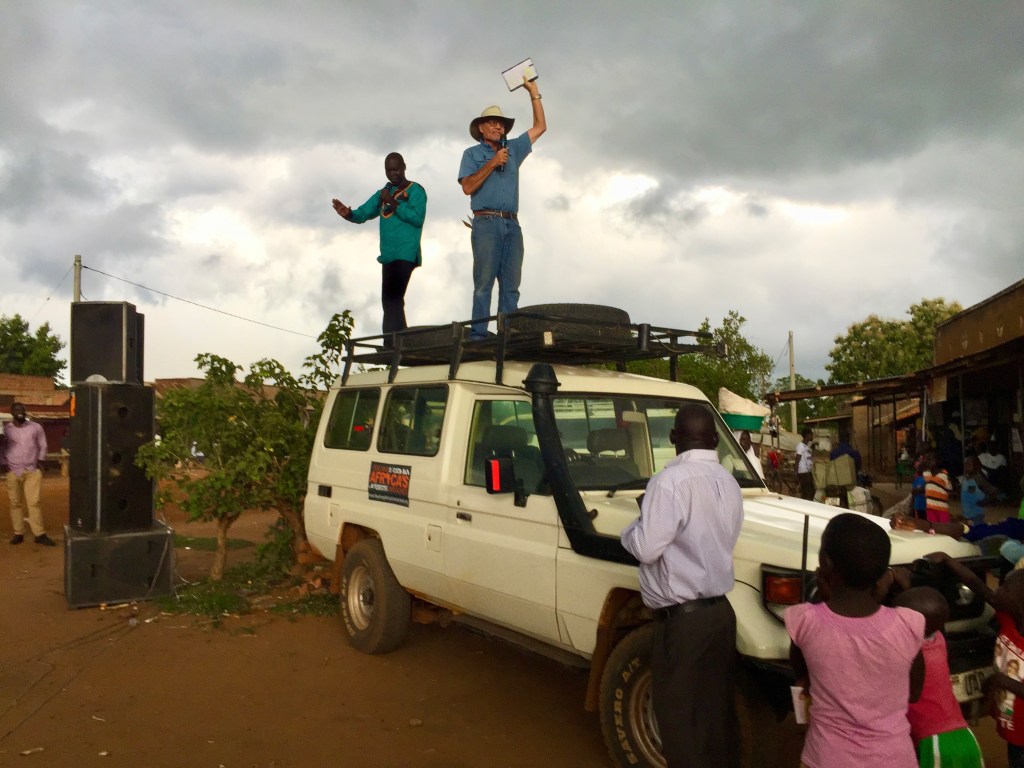 Late on Monday afternoon, we went to a market (primarily Muslim ..guessing 97%) and the youth lead in vibrant worship and praise. Gospel tracts were also given out by us with the hope of an engaging conversation. People enjoy the Aringa-English side by side and some even came to ask for them. Carol had a great conversation with one of the Muslim leaders in the crowd. Charles and I went up to the Land Cruiser rack and began preaching..it was going well and then rain came. At first I was saying to myself, “Why Lord? So many are listening.” Well, we were forced off the rack and the rain became heavy. The Youth moved the sound equipment quickly to a veranda and Charles and I went to a section of veranda where the iron sheets jutted out and made a covering. There we picked up right where we left off…Charles, who was translating, and I have been doing this together since 2014 so we are now like a couple well-tuned pistons together. As I looked about I saw the crowd, now under the verandas, not wanting to move because of rain…maybe the preaching too? I saw, then, we had a “captive audience” which gave me great encouragement. Our Lord has His ways. In these open air preaching events where we go to different markets, I usually preach from Mark 2:1-12 or John 10:1-18.