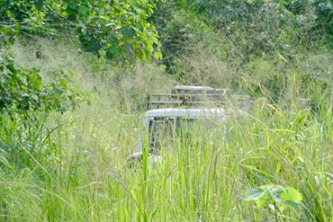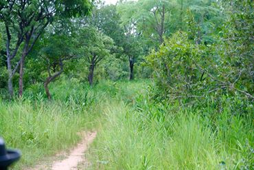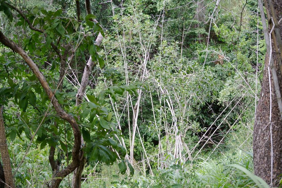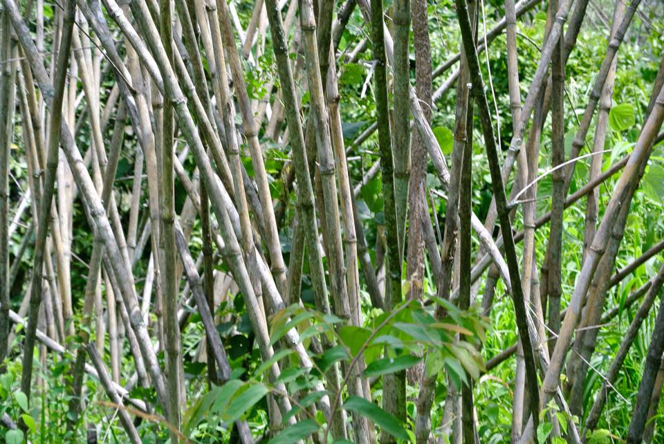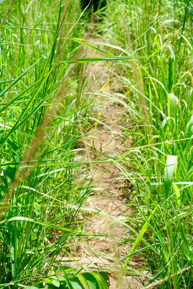 Reaching the bottom of the hillCrossing one of many streamsNarrow, grassy pathsBamboo forrest